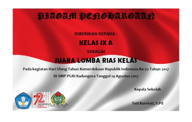 Download piagam 17 agustus hut ri ke 74 tahun 2019 info. Memberikan piagam kepada pemenang peserta lomba atau juara kelas merupakan salah satu bentuk ucapan selamat secara simbolik. Contoh piagam 17 agustus hut ri ke 71 tahun 2016 piagam penghargaan Contoh desain piagam penghargaan ksm yang bisa dijadikan sarana pengabadian sebagai piagam penghargaan bagi siswa terbaik dalam ajang kompetisi sains madrasah. Piagam penghargaan lomba hut ri. Pin di ide ide untuk rumah format 650 x 942 contoh surat undangan malam tasyakuran agustus hut ri format 441 x 643 pixel download upacara hut ke republik indonesia universitas padjadjaran format 2480 x 3507 pixel download contoh proposal agustus. Namun penerima bukannya senang tapi malah kecewa berat. Download desain spanduk malam tirakatan hut ri ke 70 file jpg size. Perayaan hari kemerdekaan republik indonesia yang jatuh pada hari jumat, 17 agustus 2018 akan menjadi hari dimana kita mengenang jasa para pahlawan yang berjaung dengan rela mengorbankan jiwa dan raganya untuk kemerdekaan ri. Blue certificate design template in geometric shape. Uang pembinaan dipotong pajak 5. Cara cepat membuat sertifikat di microsoft word dengan data. Desain sertifikat lomba hut ri agustus elegan gold.